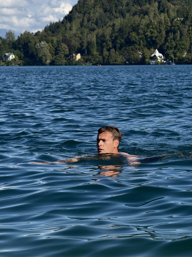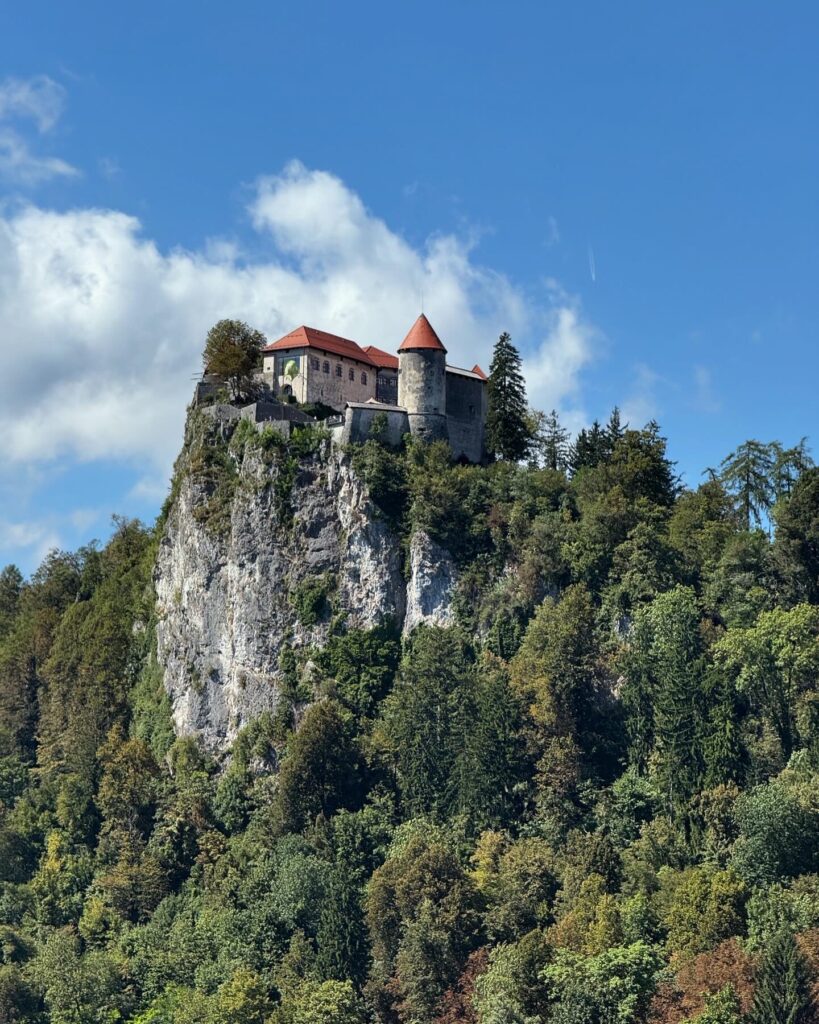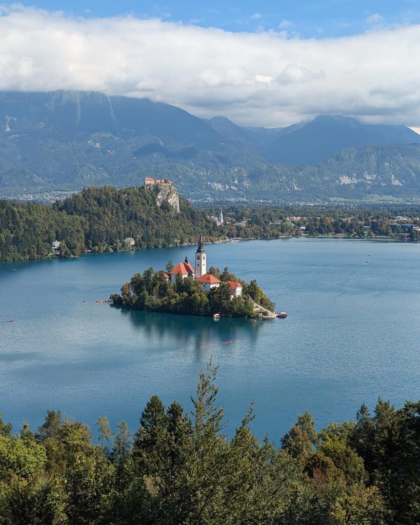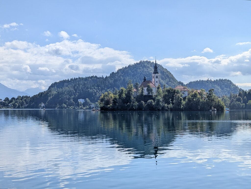 After our hike to the viewpoint we continued along the path to get to town. Our objective? Try the original Bled cake from Park Cafe. We enjoyed our fika of splitting a slice of cake and I had a glass of wine. The cake was creamy with a flaky topping, which was a nice combo. The cake was incredibly difficult to eat smoothly. Getting the top part together with the cream was a struggle and there were wasps flying around. Somehow we managed, though. Once back at our hotel we enjoyed a refreshing swim in the lake before bed.