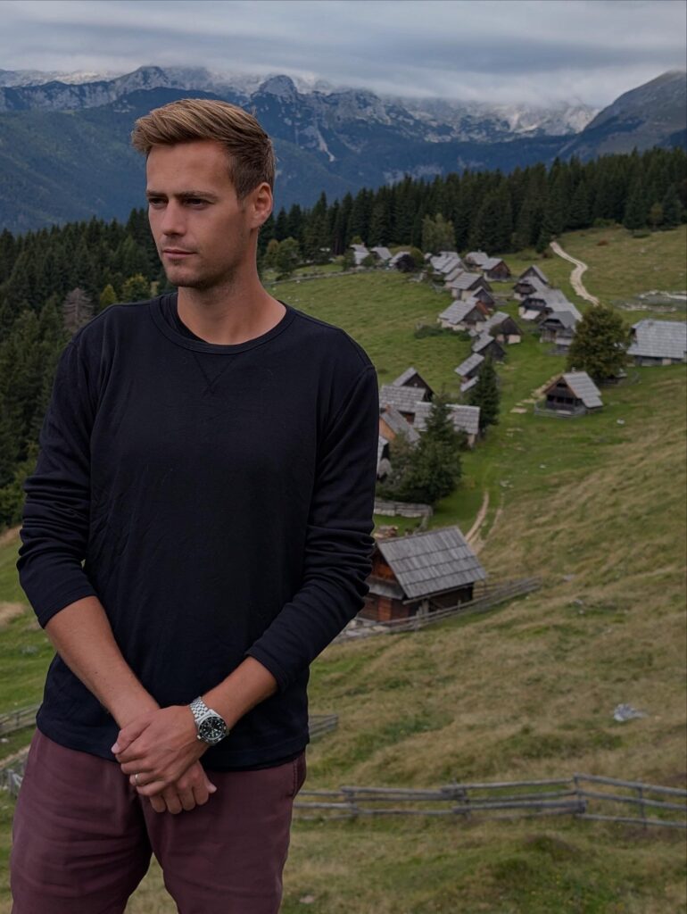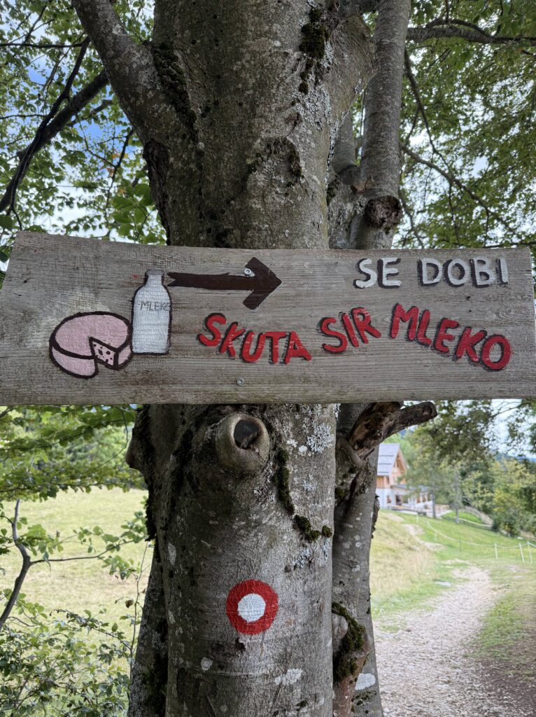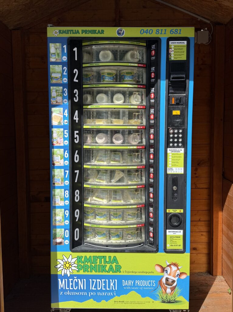 We were both feeling great after our hike and up for doing another one. The one I had originally planned seemed like a bad idea due to the weather forecast predicting a storm (spoiler alert it never came so we could’ve done it). Instead we opted for some casual walking along the river in Kranjska Gora. There were many people outside enjoying the sunny afternoon (perfect second hike weather). Nick noticed a dairy vending machine that had cheeses, yogurts, and milk. It was adorable. Finally we made our way back up Vrsic Pass (where we were originally for our morning hike) to get to the lodge we would stay at for the next two nights. We found a random trail the get to the top of a view point by another lodge. The trail was so steep and non existent I was sure that Nick was taking me on a wild goose chase, but it turned out to be a nice little hike with a great view.