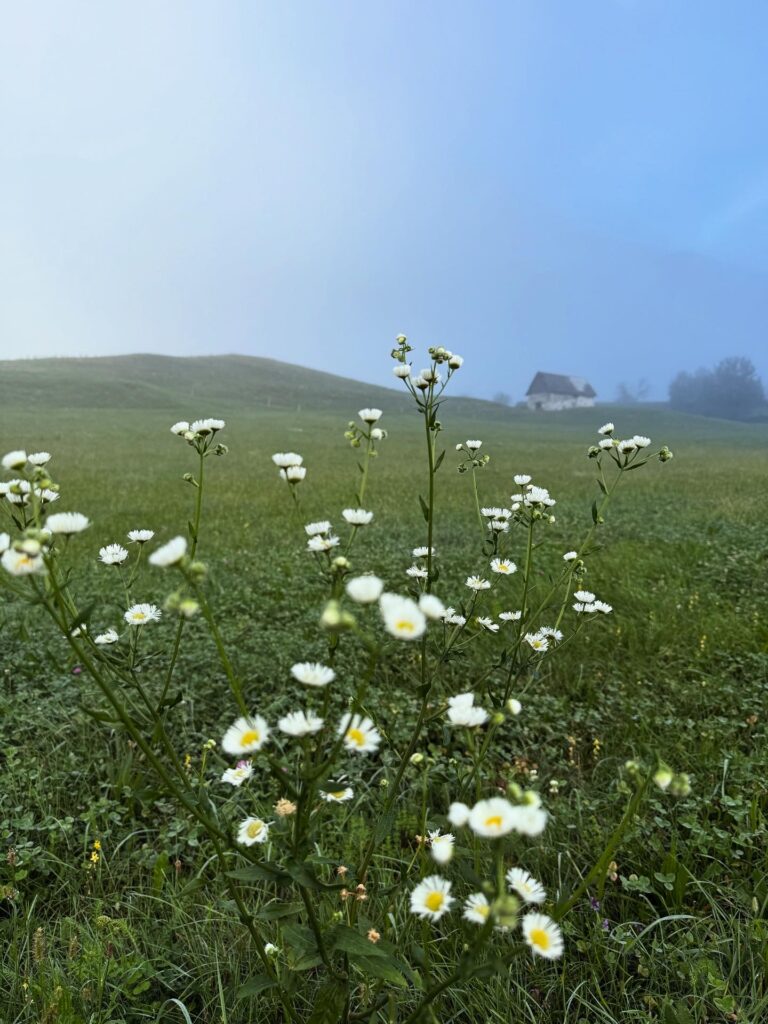 On our way back we tried for a second time to find the cheese house our airbnb hosts had told us about. There were many signs all pointing to cheese and milk (written in Slovenian). We had been unsuccessful the night before but we did find it that day. The woman there looked at us like we were crazy, though, when we asked for some milk. It turns out she was out of milk and cheese. No dairy products for us. The walk through that village was still nice, though, as they have a little church and nice purple flowers. The baby cows were so fuzzy and adorable, too.