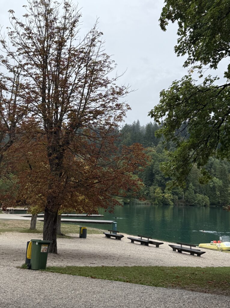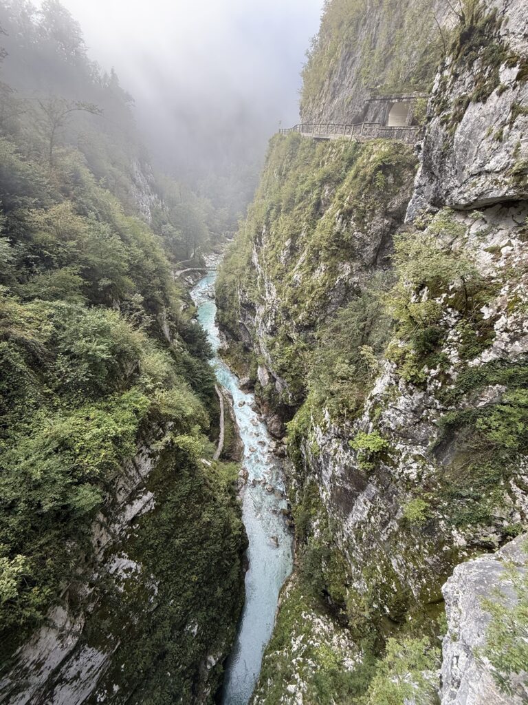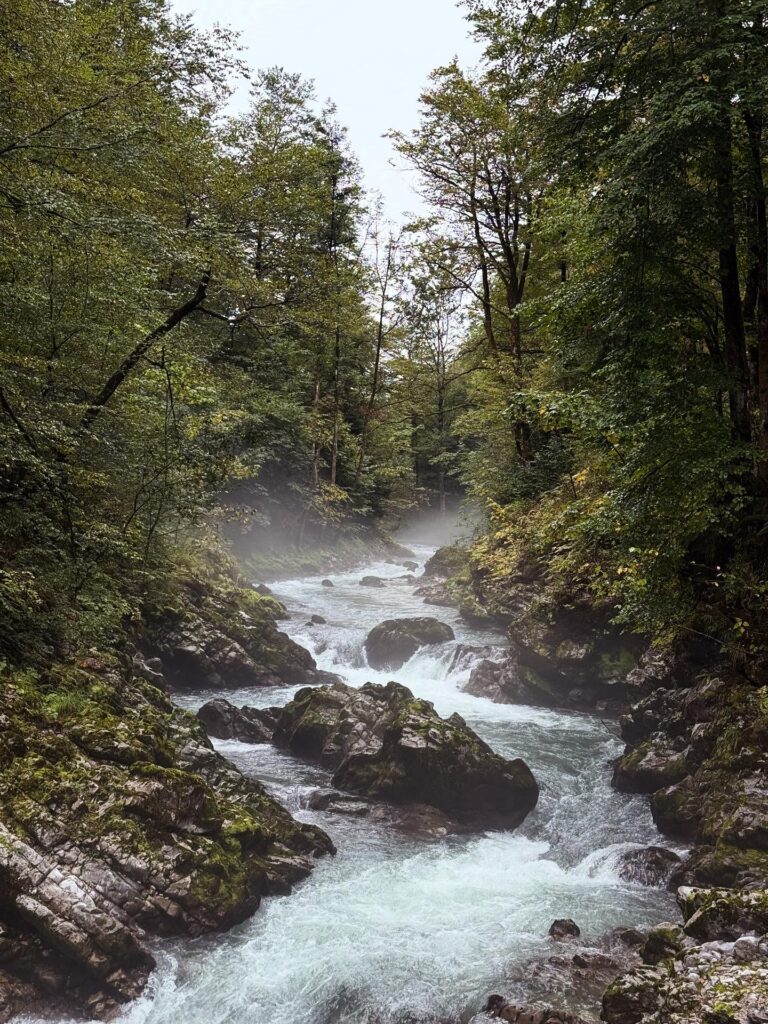 A short 10 minute drive away from our hotel was the gorge we were going to visit. Once we arrived, we were told we went to the wrong area and had to go back somewhere else to buy tickets. That was fine as I had forgotten my breakfast back at the hotel anyways (which has a 50/50 chance of being disastrous as far as hanger goes). It was not an efficient morning, but it ended up being great we went back to the hotel because the morning was misty and beautiful. We took advantage of being back by the lake and walked a bit to enjoy the same views from yesterday, but misty instead of sunny. Finally we were back at the correct ticket office for Vintgar Gorge about 1.5 hours after we had initially tried to go.