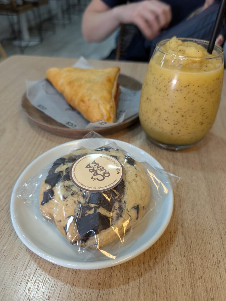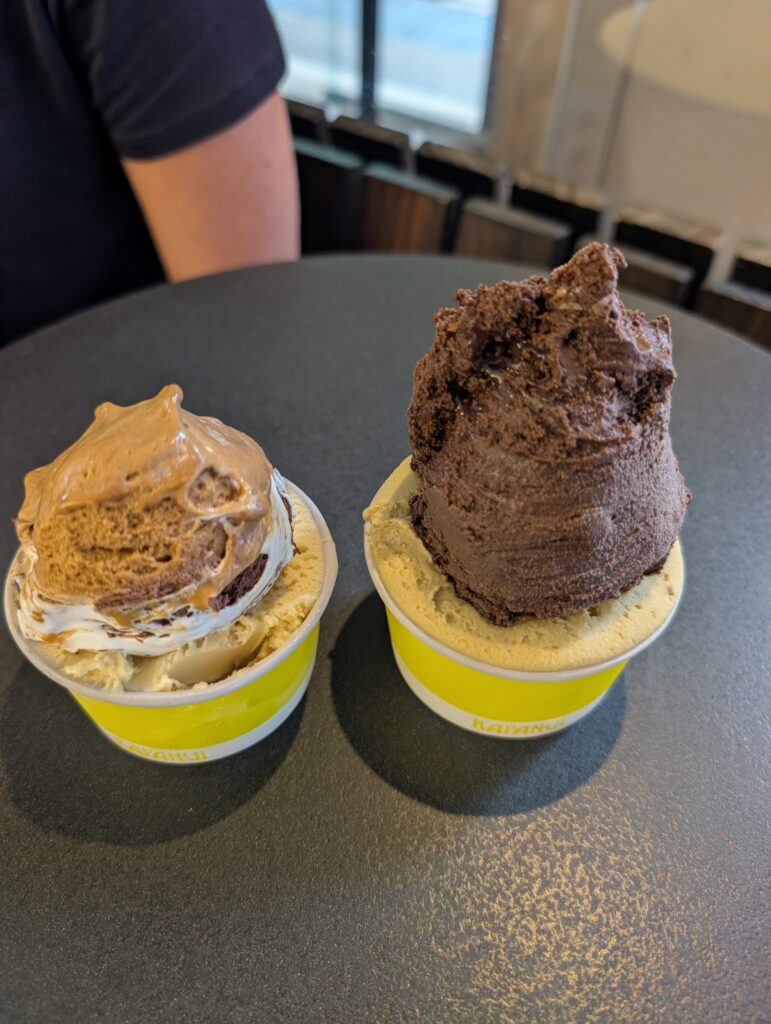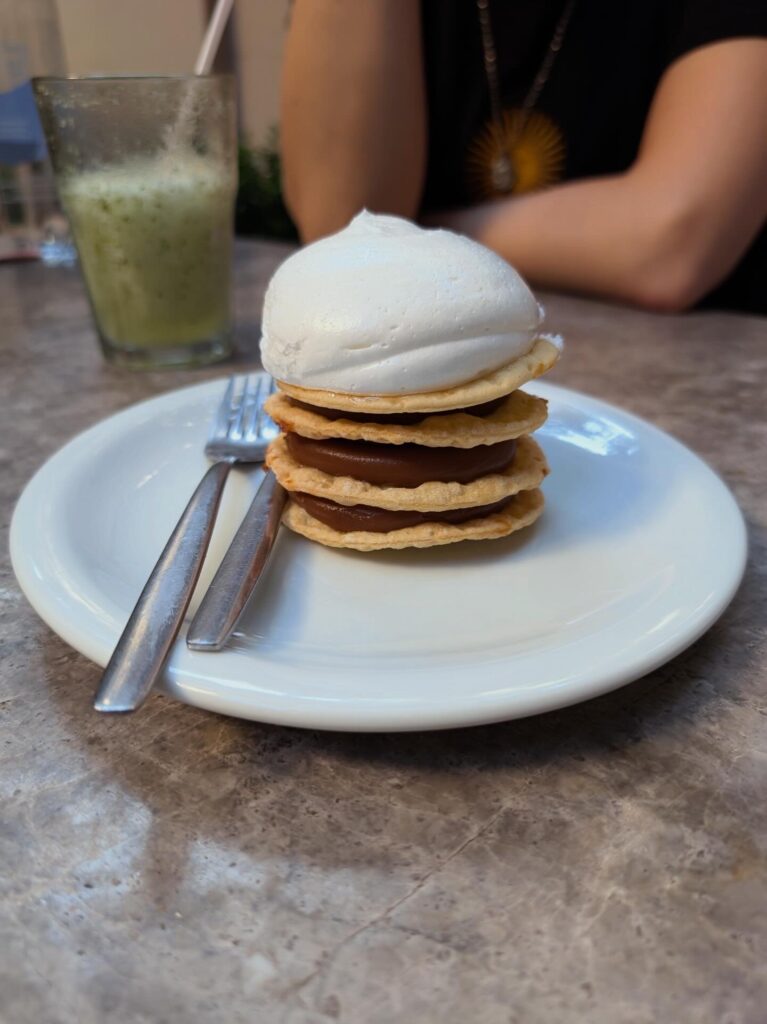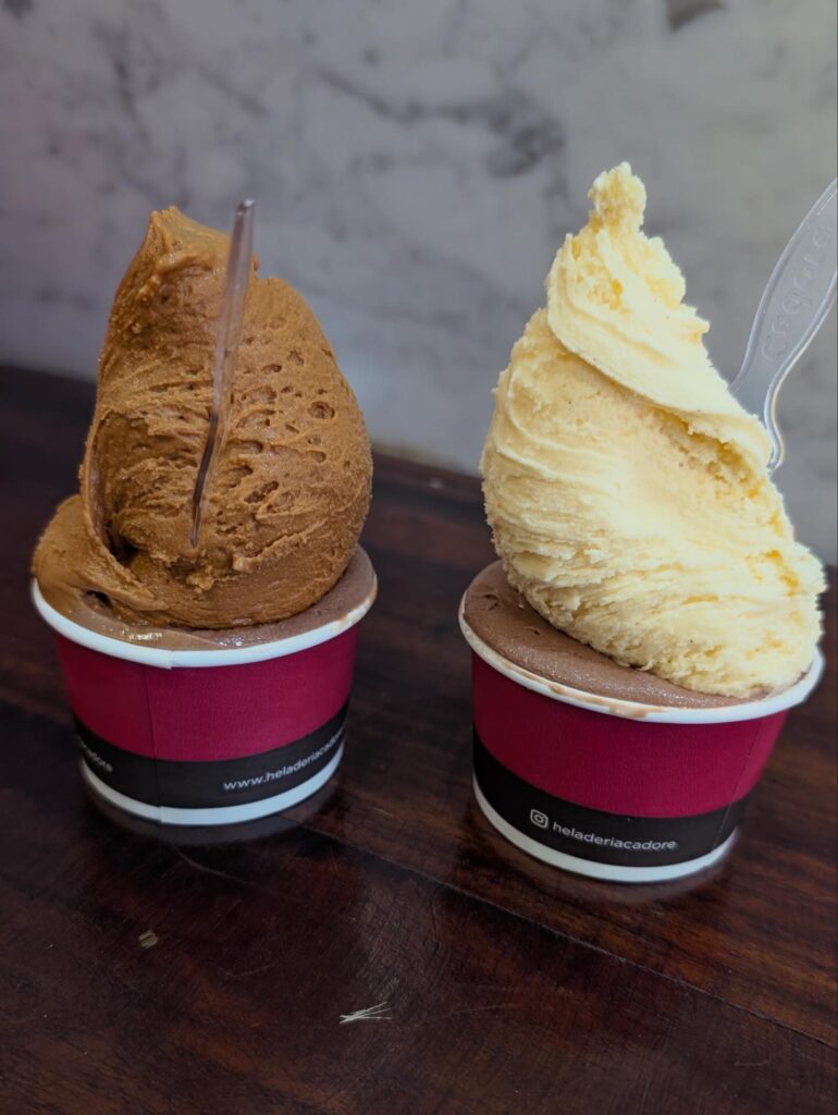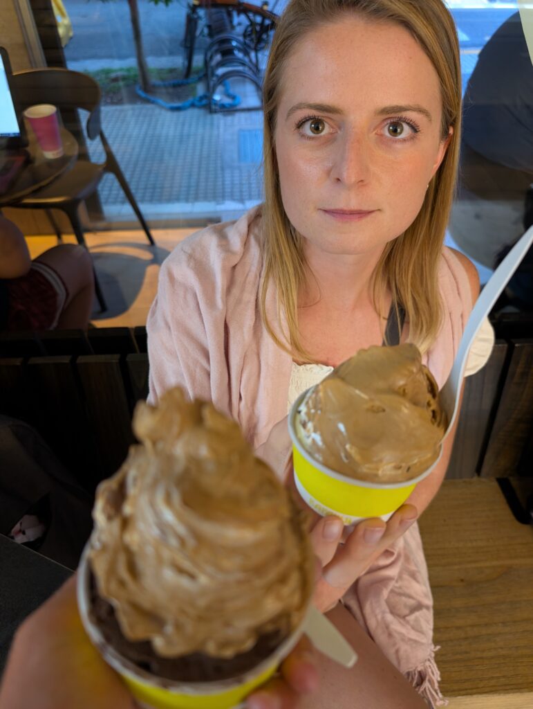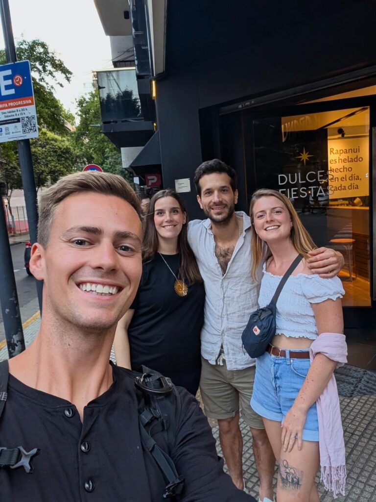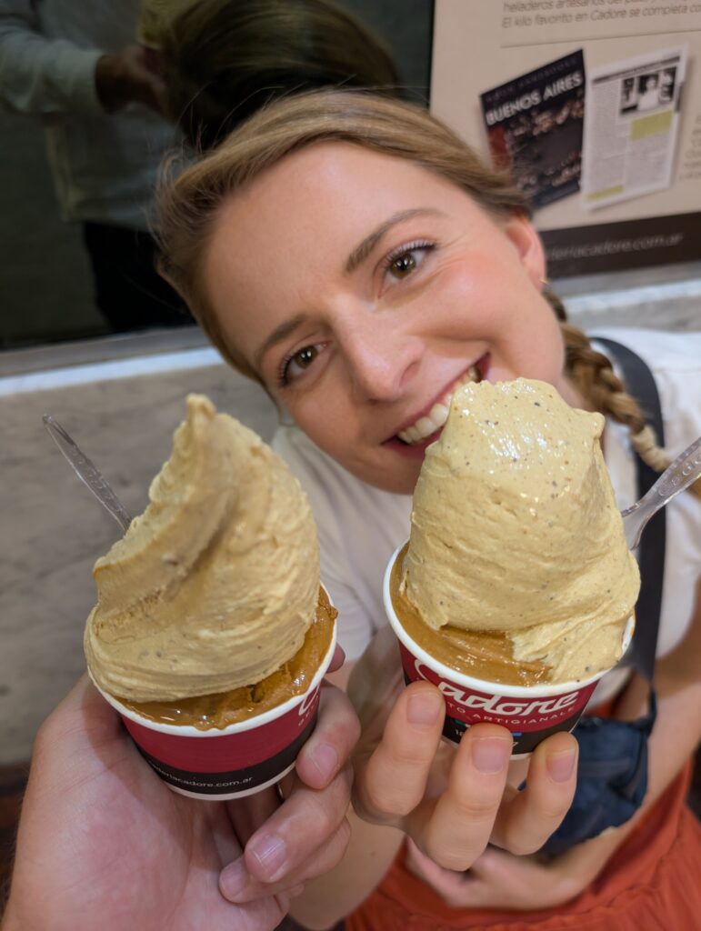 Instead, we walked to Como en Casa, a cute cafe with outdoor seating where we met my old classmate, Kevin, and his fiance. We did our bachelor’s together in Sweden and hadn’t seen each other since 2015 when we graduated! It was super nice getting to catch up after so long. Time really does fly by the older you get. We got lemonade and Nick and I shared a milhojas (a pastry traditionally served at baptisms apparently). On our way home we stopped at Rapnui. Kevin and I agreed that the Italians may have introduced gelato, but the people of Buenos Aires mastered it. That time I had the dulce de leche with chocolate mousse and italian meringue (my favorite one from last time), and a scoop of dubai chocolate. It was much better than my cognac one. Unfortunately, I did not realize I was also in our last ice cream photo so please enjoy my ice cream mug shot. Guilty as charged of blowing the budget on ice cream. It was a great way to end our time in such a beautiful city.