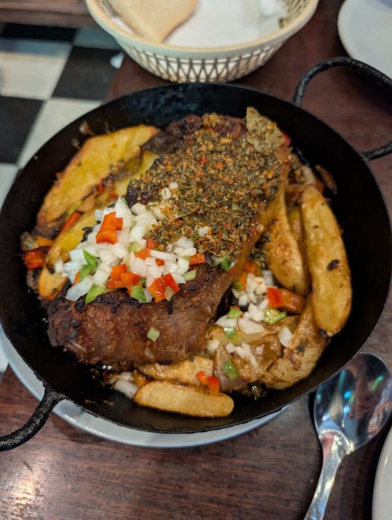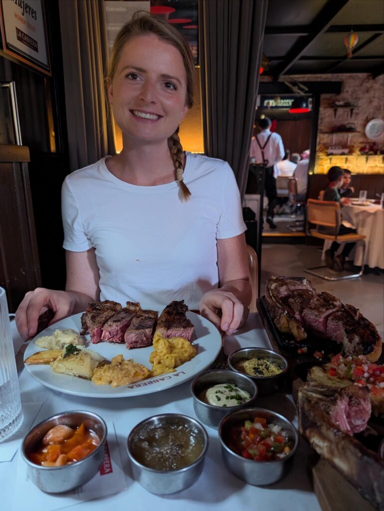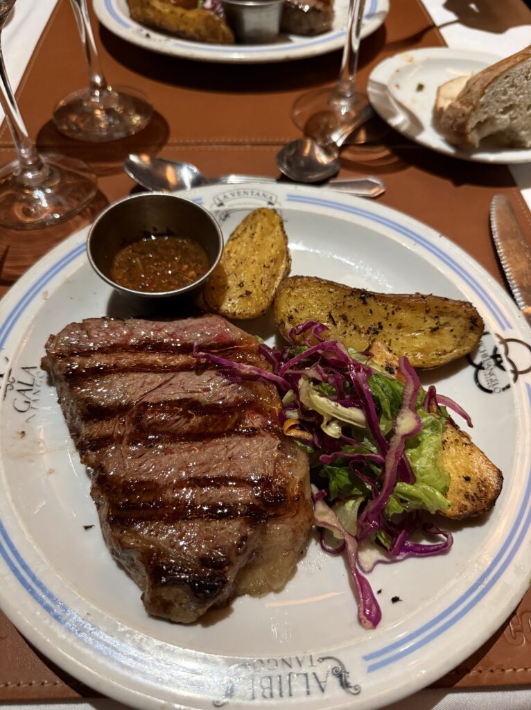 Post ice cream we walked over to lunch which was at La Cabrera. There we shared a caesar salad and each got our own dry aged steak. I had been curious to try the caesar salad since we had seen it advertised all over the city. It was a good salad, but didn’t have the iconic garlicy, lemony caesar flavors we are used to in the USA. A common trend getting the salad abroad is that it looks like a caesar but doesn’t taste like one. The steak came with several small side dishes including mashed sweet potato, mashed potato, scalloped potato, confit garlic, apple sauce, garlic mayo, and creamed corn. The corn was the star of the entire lunch, it was so yummy. We were not sure if our steaks were just not good cuts of meat or what, but the steak was very tough and bland, not what you would expect from a dry aged steak. I definitely got a sore arm trying to cut the steak, but the sauce, sides, and salt helped. We couldn’t help but leave disappointed. Our budget didn’t allow for multiple steak meals so it was our one shot. With it being both expensive and not great, that was a bummer. Thankfully we had been super lucky with good food in Argentina up until then, so it was easier to take the loss.