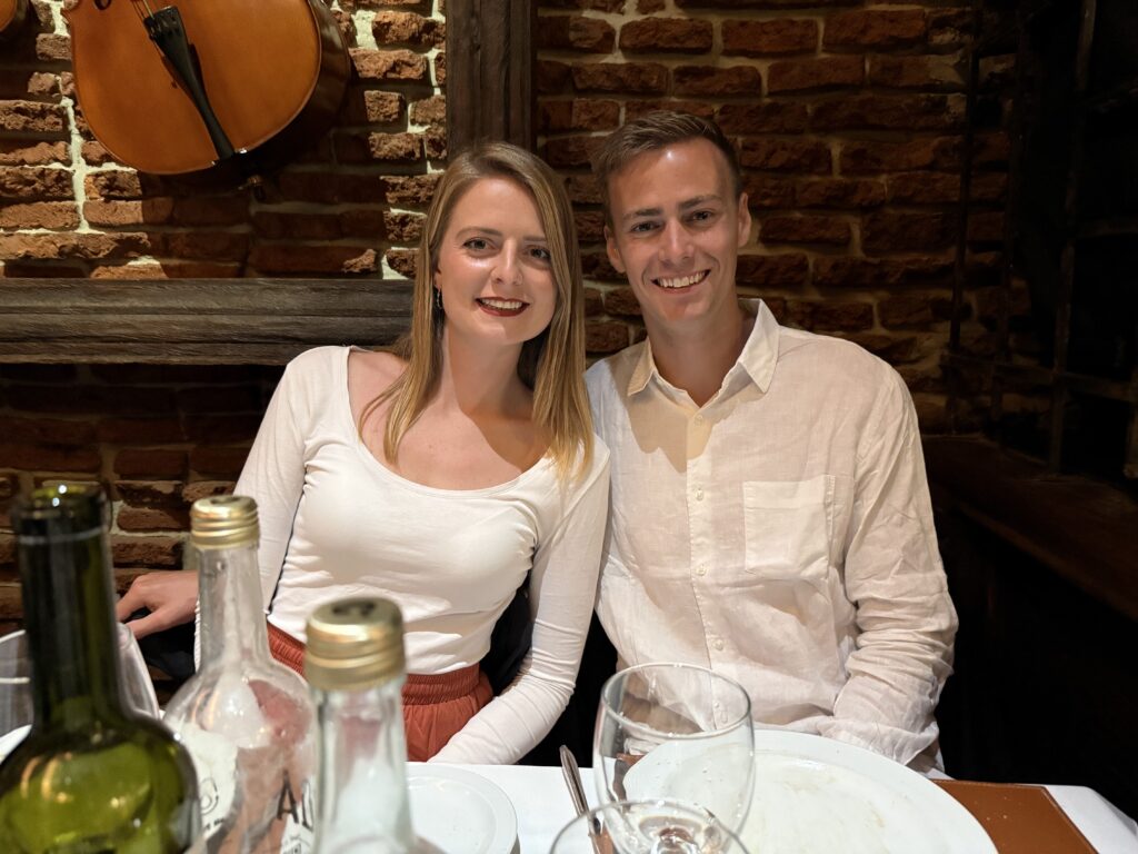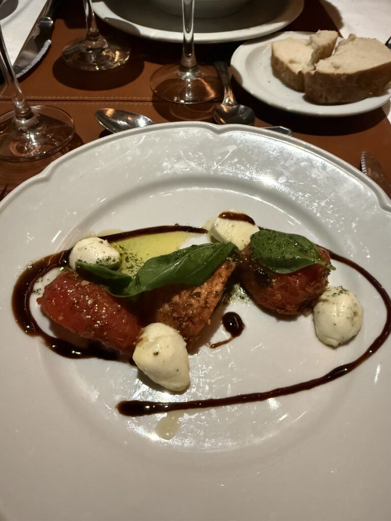 In the evening it was time to do the quintessential Buenos Aires tourist activity, a tango show. We were picked up at 6:30pm and made it inside the theatre at 7:00pm. The theatre had a warm energy with all the dark wood features. The tables were for 4 people so we were seated with another American couple who were very nice. Our table was also right up front by the left corner of the stage, which was fantastic. Each couple got a bottle of wine; I tried the white and the other couple had red, both from Argentina. Nick and I chose the caprese salad for the appetizer and the steak for the main course. Both of which were surprisingly delicious for an included dinner at a touristy attraction. Nick got the poached pear for dessert and I got a delicious ice cream sundae with meringue and fresh fruit. Our photo together was a bit blurry but I was just thankful the couple across from us offered to take one in the first place.