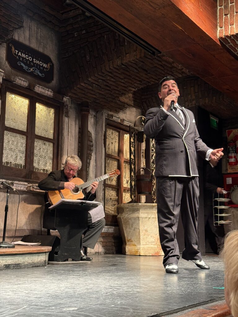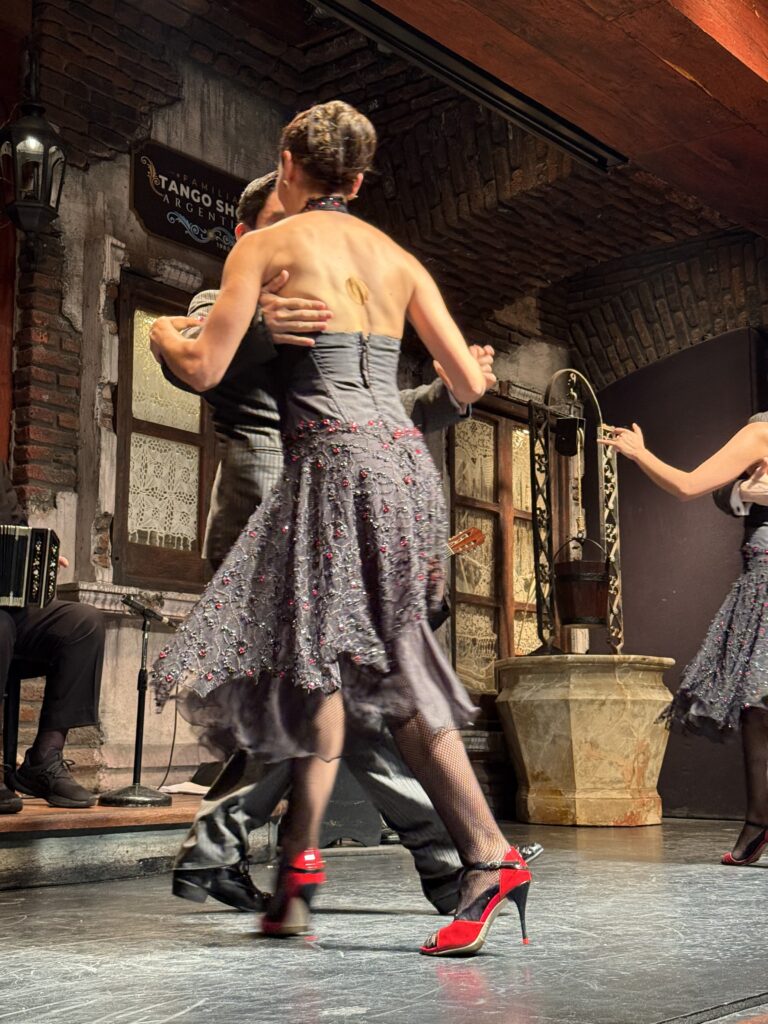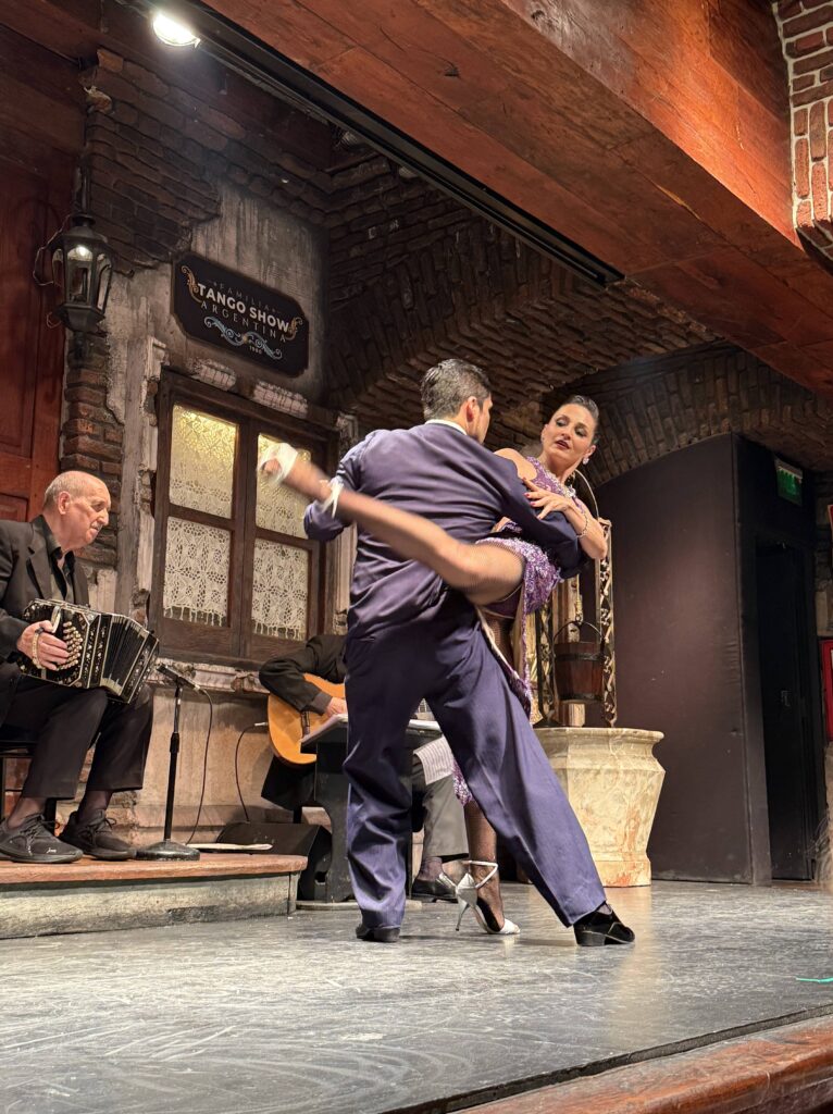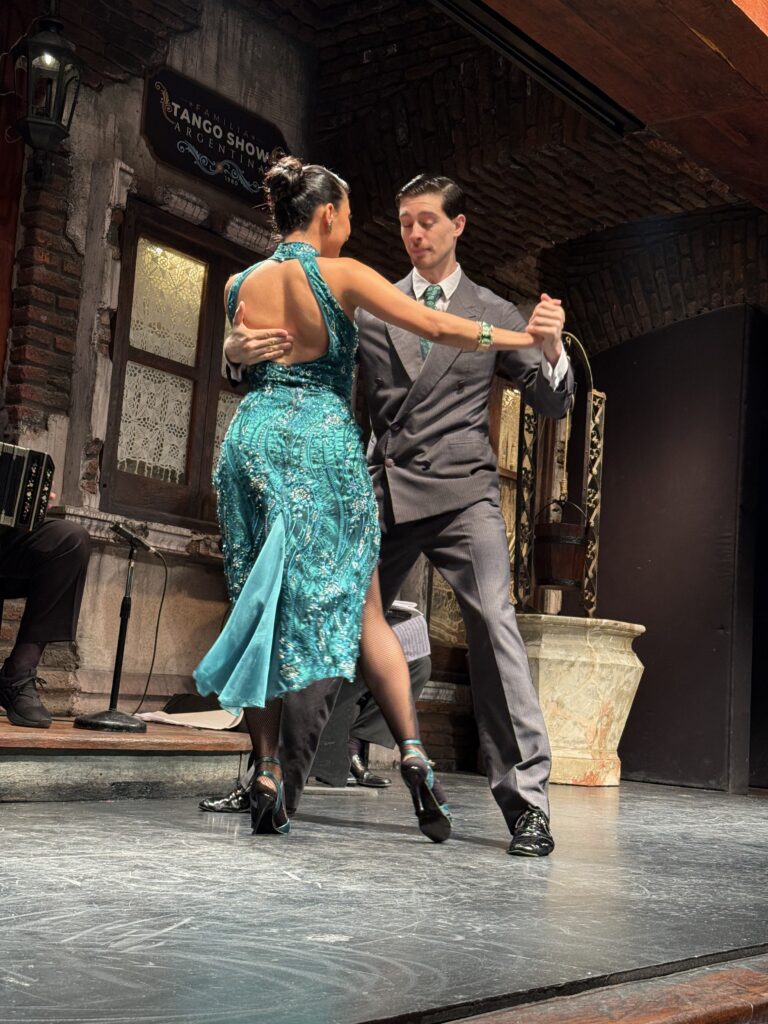 Once we were on to our desserts the show began. There was a live band with a stand up bass, guitar, piano, and accordion. They were engaging and fun to watch. The show lasted over an hour and was several performances. There were 4 couples who did various tango dancing choreographies. In between dances a male singer would come out and deliver breathtaking vocals. He must have been singing Argentinian classics because several tables were singing along passionately. One of the older dance pairs also did drumming, flamenco snapping, and some sort of rope swinging with beads hitting the floor to a fun rhythm.