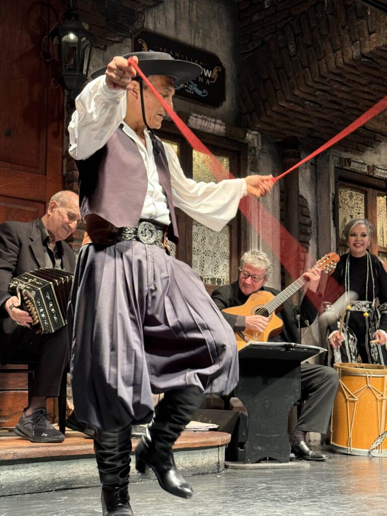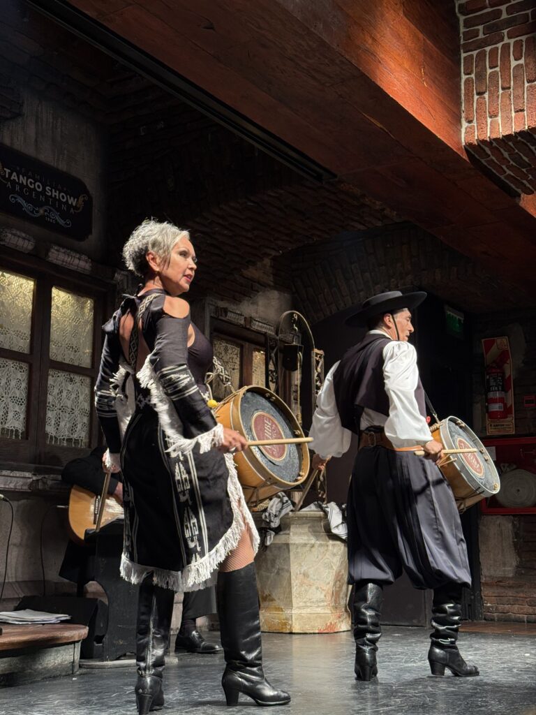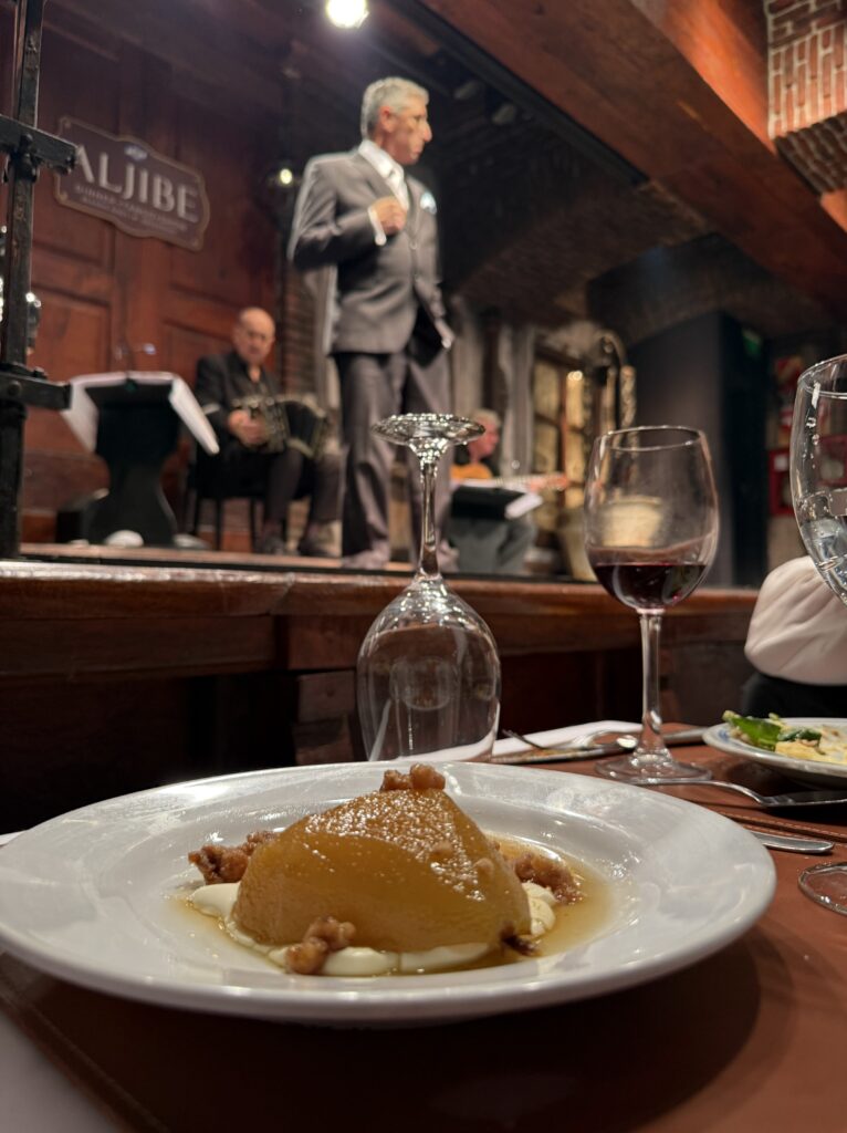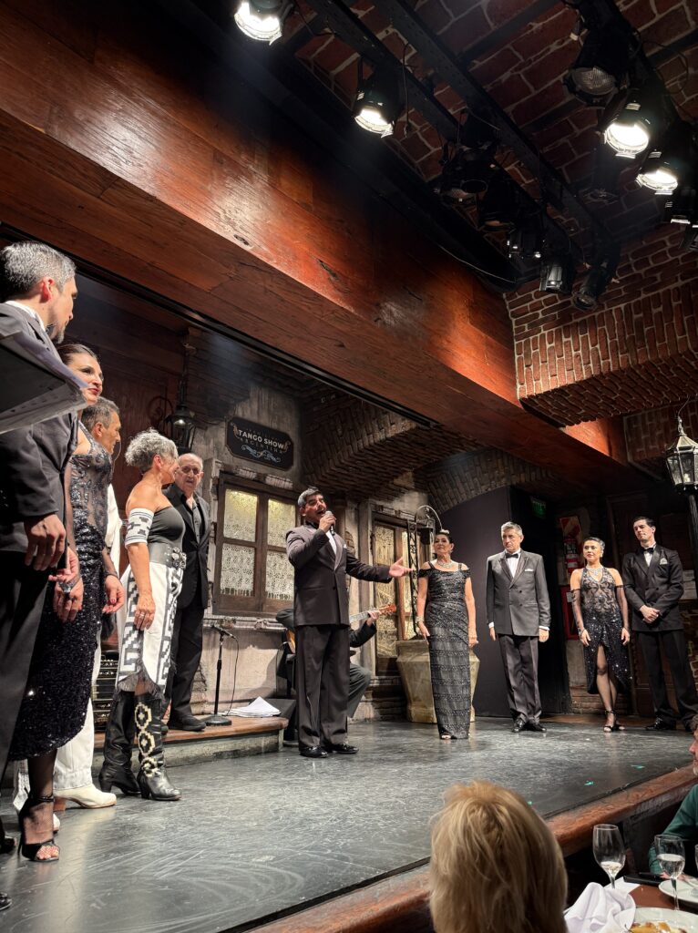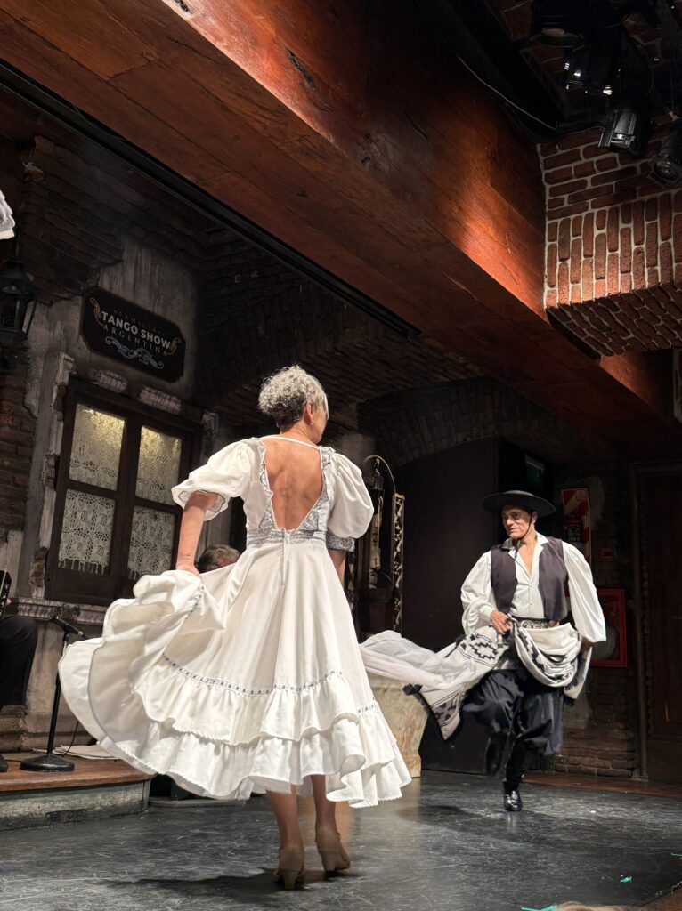 Once we were on to our desserts the show began. There was a live band with a stand up bass, guitar, piano, and accordion. They were engaging and fun to watch. The show lasted over an hour and was several performances. There were 4 couples who did various tango dancing choreographies. In between dances a male singer would come out and deliver breathtaking vocals. He must have been singing Argentinian classics because several tables were singing along passionately. One of the older dance pairs also did drumming, flamenco snapping, and some sort of rope swinging with beads hitting the floor to a fun rhythm.